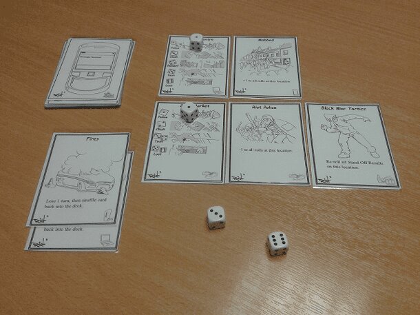 Britain is broken. Things are not well in the Big Society. But this time the mob has the edge... Mobile phones. Riot is a free print and play solitaire card game based on the 2011 UK riots. Your phone bleeps with a text.. what's up. Draw a card, maybe the riot police are on their way or its kicked of at the retail park. Pick a Location card to raid, roll...