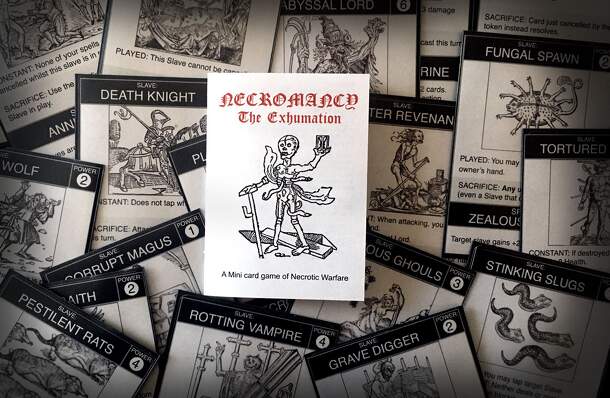 You are and evil Necromancer, searching the mouldering crypts and dusty tombs for decomposed cadavers, unholy spirits and demonic fiends to arise and do your infernal bidding. But you're not alone in this dark and forgotten place; a rival of equal evil awaits... Necromancy: the Exhumation is a micro-card-game reminiscent of Magic: the Gathering but simpler...
