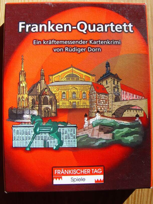 This card game features major cities in Franconia, a German region rich in history and (only) politically part of Bavaria. Cities include Nürnberg, Würzburg, Bayreuth, Bamberg, and Rothenburg, among others. The object of the game is to collect melds of cities by winning cards from your opponent in classical quartet showdowns. Franken-Quartett is a variant...