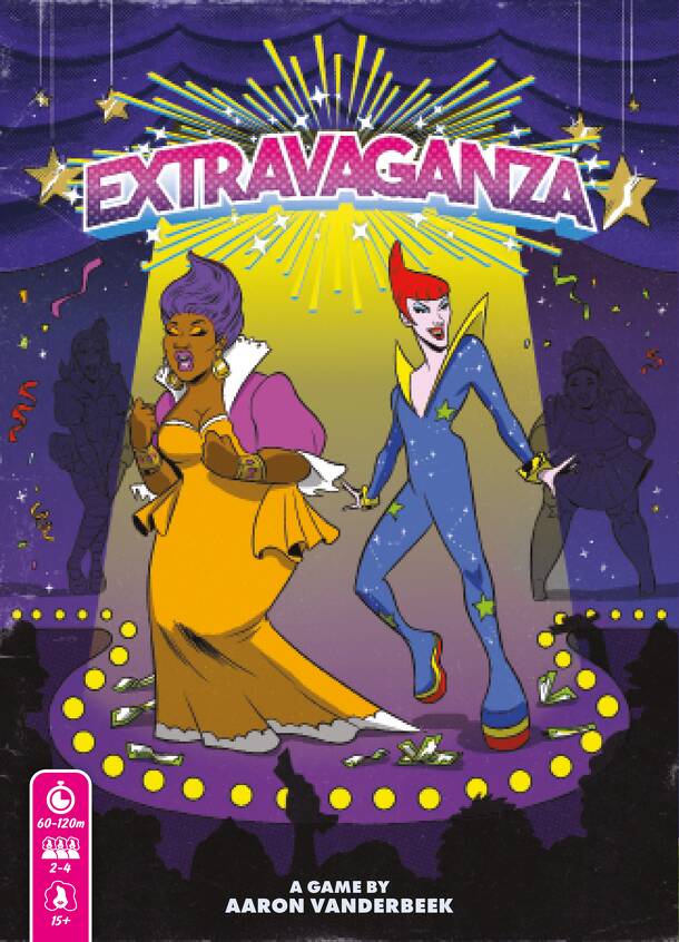 Extravaganza is a strategic lip-sync battle board game for 2-4 drag queens. The game takes place over the course of a single song, made up of lyric tokens. Each of the 5 judges chooses a random dance move category that will be judged during the game. On your turn: BEDAZZLE: draw random rhinestones from the bag and add them to your stage area. MOVE: like a...