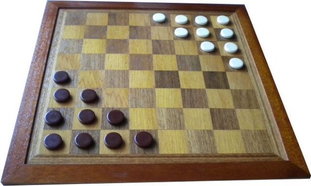 The game if similar to Halma or Stern-Halma (AKA Chinese Checkers) but is played strictly by two players with a standard draughts set. Each player starts with pieces at a corner of the board, and the object is to move all one's pieces to thee other player's starting position before the oponent does the same. No captures are made but pieces can jump as in...