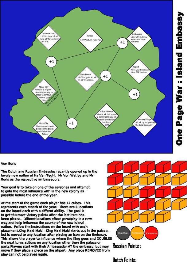 From the One Page Wars game series. "The Dutch and Russian Embassies recently opened up in the lovely new nation of Ha Van Teghi. Mr. Von Watley and Mr. Boris as the respective ambassadors." "Your goal is to take on one of the peronas and attempt to gain the most influence within the new colony as possible before the end of the year." Players take turns...