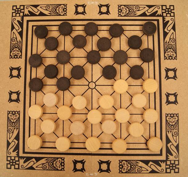 From Zillions-of-Games: Kharbaga belongs to the Zamma family. It is an African checkers variant played on a special pattern that is different from the well-known Alquerque pattern. Whereas the Alquerque pattern reduces the number of diagonals, the Kharbaga pattern reduces the number of orthogonals. The result is a different game dynamic. It is a very...