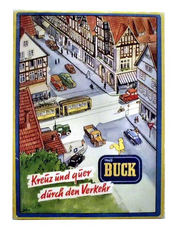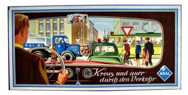 Every player gets a car and has to get from the starting space at the gas station to his garage. On the way the players have to mind the traffic rules. On spaces with a blue or black disk, the player has to draw a card and must follow its instructions. The first player to reach his garage wins the game. The game has to be been published in 1952 or early...