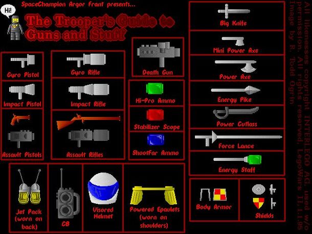 Lego Wars was the first of the "brick powered" wargames. It is the ancestor of Brikwars and inspiration for many of the other Lego wargames out there. An excellent game if you have a lot of Legos lying around. Easy to customize your own army. Lego Pirate Wars—written by Stephen W. Gabriel—had it's rules published as magazine articles in 1995/1996....