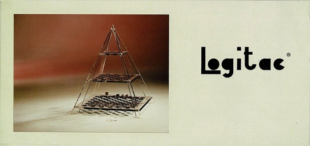 A chess-style abstract strategy game played on a pyramid of four boards: 12x12, 8x8, 5x5 and 1x1. Each player has a pyramid (king), a cube (rook), a cylinder (bishop), a double-pawn (knight) and 44 pawns, and the winner is the player whose pyramid ascends to the fourth (1x1) board. The game starts with each player's pyramid, cube, cylinder and 12 pawns...