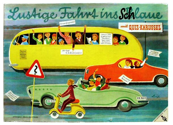 1. Lustige Fahrt ins Schlaue Each player gets 10 game token and a car to place on the starting-space. A quiz-card is placed on each grey space and a event-card on each red space. The movement of the cars is determined by a die. If a car lands on a pace neighbouring an event-card, the player has to follow the instructions printed on the card. If a car lands...