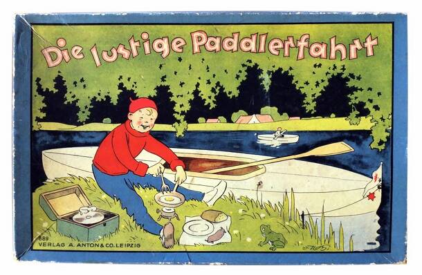 Each player has 3 frogs, he has to get from the starting spaces of their color at the bottom of the game board to the destinations of the same color at the top. Movement is determined with one die. On the roll of a "1", a frog may advance from it's colored starting space to the firs green space of his race track. From there the frogs advance according to...