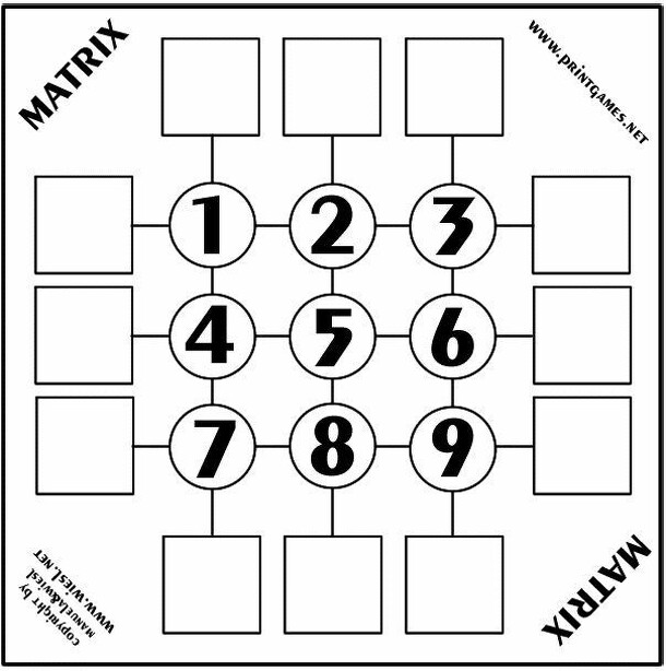 A simple abstract game played on a 5x5 board (minus the corners.) The board has a 3x3 area in the middle with the numbers 1 through 9, plus 3 blank spaces adjoining each side of the board. The object of the game is to reach all 9 numbers by creating 'matrixes'. Each player has 2 pieces which are placed one at a time on the bank spaces on the outside edge...