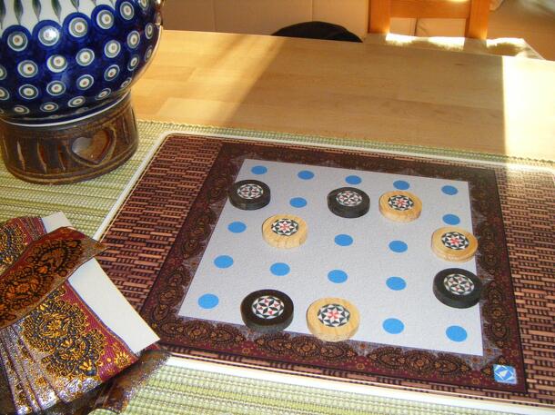 Visit Mondrago on VideoGameGeek, too. The version allows to play the game with two players sharing a mobile phone or tablet device. Two opponents play on a board with 5 x 5 fields. Each player has 4 pawns. The pawns are aligned on the opposite borders. Both players have a pair of pawns on each side at the beginning of the game. In alternating manner...
