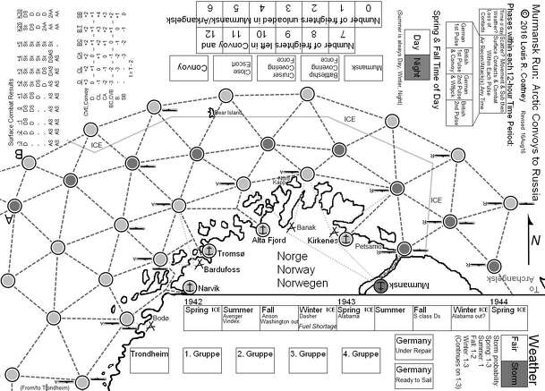 Game description from the designer: Simple/abstracted. 9 seasonal turns, Spr42-Spr44. Hidden task force movement until recon/contact. Destroyer divisions (4 ships) and individual warships of higher classes, from Koeln to Tirpitz for the Germans and Scylla to Alabama (to Victorious) for the Allies. 8 of 12 freighter loads must make it to Murmansk and/or...