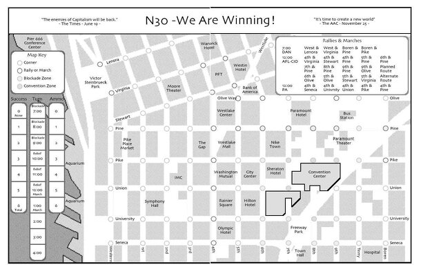 A game of the "Battle of Seattle" in 1999. Two players, 11x17" map, 168 counters. 13 pages of rules & 7 of notes. This is a complete redesign of N30 I and N30 II at a more detailed scale. "N30 portrays the morning blockades of November 30th. Two players represent the opposing sides; one represents protesters; the other represents the police, with their...