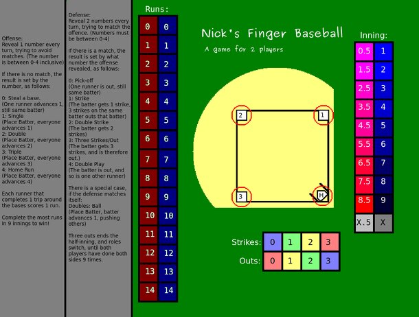 Take me out to the ball game! Nick's Finger Baseball is a free, two player game of strategy and outwitting. Playing the role of the captains of two baseball teams, both endeavor to lead their team to victory. Over the course of 9 innings, there are a large number of turns. In each turn, each player simultaneously reveals their strategy for that part of the...