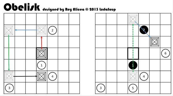 Obelisk A strategic two-player board game Components - 7x7 grid board - 48 Reversi/Othello pieces - 1 white piece (the Obelisk) Objective Be the last player to make a valid move. Key Term "Adjacent" includes orthogonal and diagonal spaces. Setup 1. Place the Obelisk in the board's center. 2. Choose the starting player. 3. Turns alternate. Gameplay On your...
