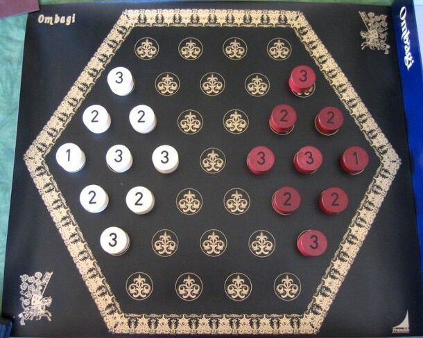 A 2-player abstract strategy game where the aim is to get your 12 pieces to the opposite side. They start and must finish in 4 stacks with a 'number 3' on top, a 'number 2' in the middle and a 'number 1' on the bottom (numbers are embossed on the pieces). The numbers determine the steps each piece must move and also indicate the highest level they may...