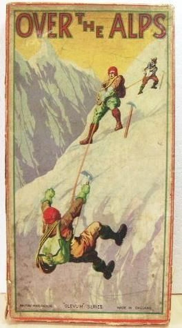 Over The Alps board game was made in England as part of the Glevum Series in around 1930s. As the title suggests – it has a mountaineering theme, which is highlighted by the image on the box lid. It is a simple race game, played with dice and counters. But what makes it more attractive is that the board – which is stored folded in the box needs to be stood...