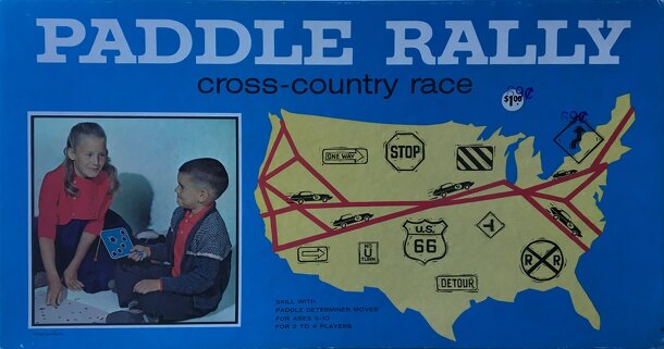 This Sixties race game from Whitman has a very unusual mechanism for determining how far a player can move. This is an 8" long blue plastic paddle, shaped like a rounded diamond with handle. A small red ball is attached to the end of the paddle by a 4" string. There are six holes in the paddle, five in an arc at the 4" limit of the string, and one in the...
