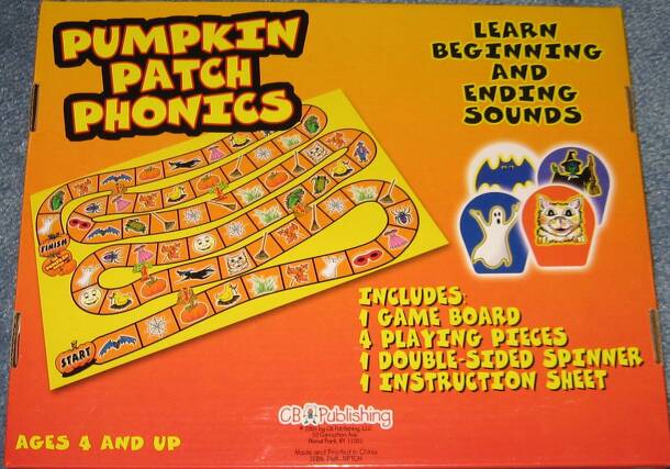 Pumpkin Patch Phonics is a simple children's game that teaches players phonics. Players spin a spinner, and move their token to the nearest picture that starts with the letter that the spinner is pointing to. There are five special spaces on the board, where a player can slide up or down the track - similar to Chutes and Ladders. There is an alternative...