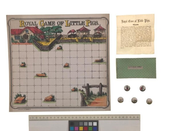 Game consist of a single sheet a box, rules and 5 counters two of one color and 3 of another color. The game is played by 2 players, one player taking two old women and the other taking 3 little pigs. The women are placed in starting spaces at the top of the board and the pigs begin at the bottom of the board. The pigs are taken when an old woman can jump...