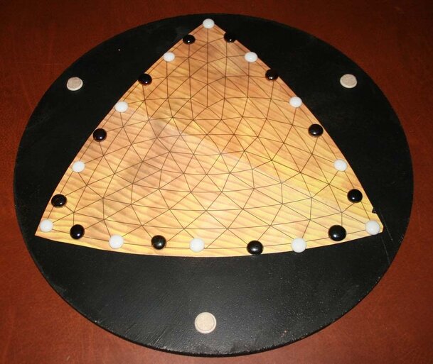 Played on the The Game of Y board. 12 stones of their own color for each player, arranged alternating around the perimeter of the board. From the website "Taking turns, players move any one of their stones by 1, 2 or 3 unit spaces along an unobstructed line, in any direction. A stone may move in only a single direction on a turn. There are no jumps and no...