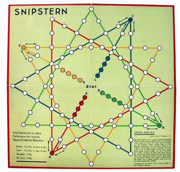 Each player has a set of pawns that start in his or her corner of the board. The goal is to move the pawns around the board to the "home" spaces. Movement is determined by a die. All players move around the board on their own track in the shape of a triangle. All 4 triangles together form a star, so the players may capture each other's pawns at the...