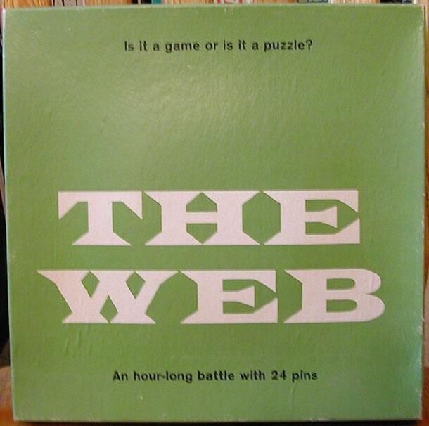The Web is a two man game played with twelve white pins and 12 green pins on the "webbed" area of the accompanying (cork) board. There are one hundred twelve small spaces and the pins never move outside the playing area. Green's objective is to keep White from scoring all twelve pins in the two hour time limit. If Green can keep even one White pin in that...
