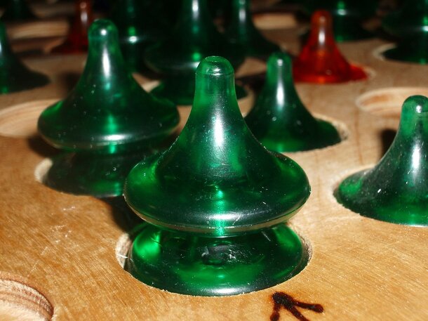 Each player has five pawns and an own section of the game board (A, B, C, D) to move his pawns. The pawns start on the spaces with the numbers 1-5 beneath. The goal of the game is to move all five pawns to the spaces marked with 1-5 in the center of the game board. Movement is determined by a die. The pawns move strictly in their own column along the...