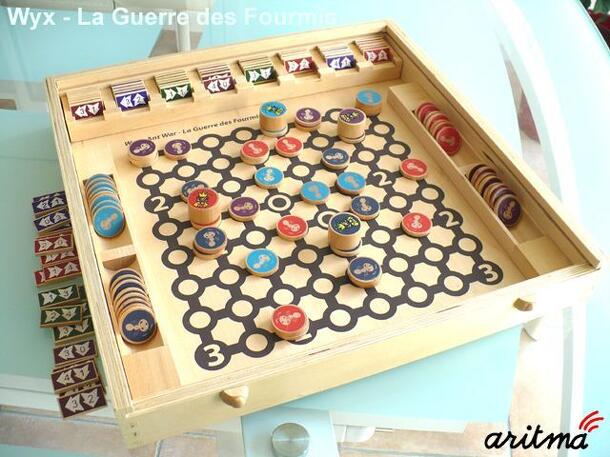 Wyx is a 2 to 4 player game where each player control an ant queen on a 8 by 8 squares board. After each move the queen lay an ant egg, althoug on some square she may lay more than one. The moves are done by chosing from 4 columns of dominos, the top of each column being visble. Each dominos have a vertical and horizontal values indicating the move the...