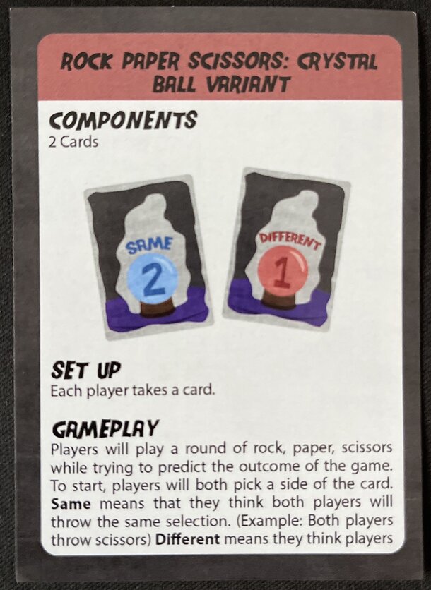 Each player receives a card with two sides: "Same" and "Different". Before playing a round of Rock, Paper, Scissors, players secretly choose a side of the card to indicate their prediction—whether both players will throw the same hand or different ones. After concealing their prediction, they play Rock, Paper, Scissors with their free hand. Once the round...