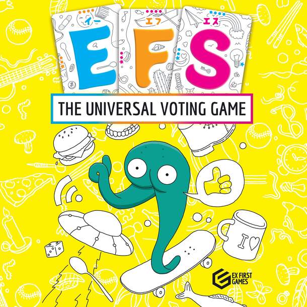 EFS is a light party game about voting, as aliens, on all the stuff found on your first visit to Earth. You picked up a lot of stuff and possibly a human or two who may be posing as aliens amongst you. Each turn, one of the players (the leader for this turn) picks a topic and everyone votes on it using the E F S cards. The letters stand for Epic, Funky...