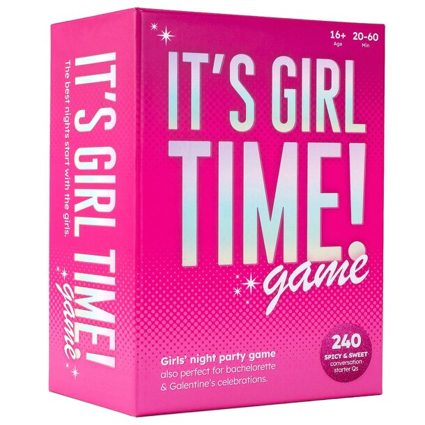 Card game for girls' nights, bachelorette parties or Galentines celebrations, made to connect women. Contains 240 cards across 6 categories of questions and challenges. Prepare to laugh, bond, and overshare! Draw a card and follow its instructions. Collect the most cards to win! Keep this if...: you meet the condition. Give this to...: another girl who you...