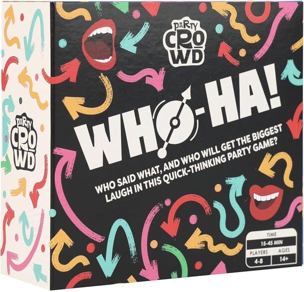 Part Crowd: Who-HA! is a bold and hilarious party card game where players act out outrageous phrases while others race to guess them. The challenge? Figuring out who said, thought or doodled what and which of your friends is bluffing. How to play: SPINNING THE WHEEL — Spin the wheel to choose a category. Take a card and tell the group. THE TEAM WRITE THEIR...