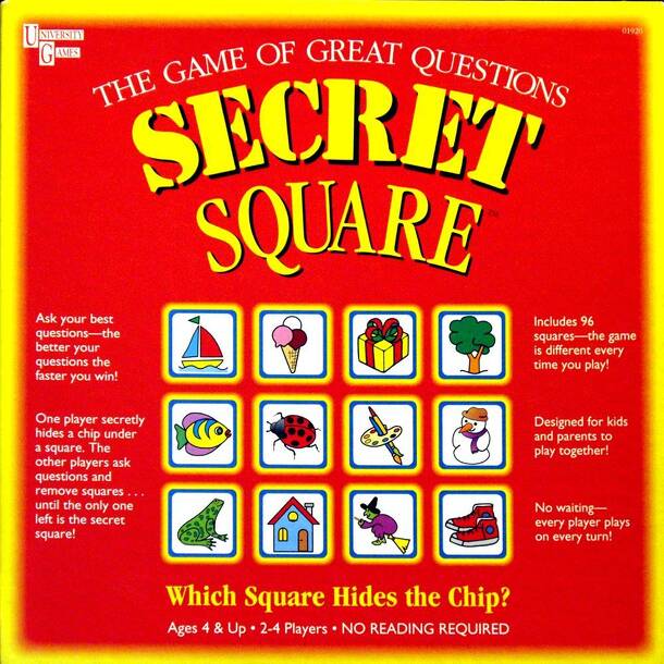 From the publisher: The Game of Great Questions! Kids love to ask questions, and Secret Square encourages great questions. One player secretly hides a chip under a square, then the other players ask questions to remove squares . . . until the only square left is the secret square. Simple enough for a 4 year-old, challenging enough for parents and older...
