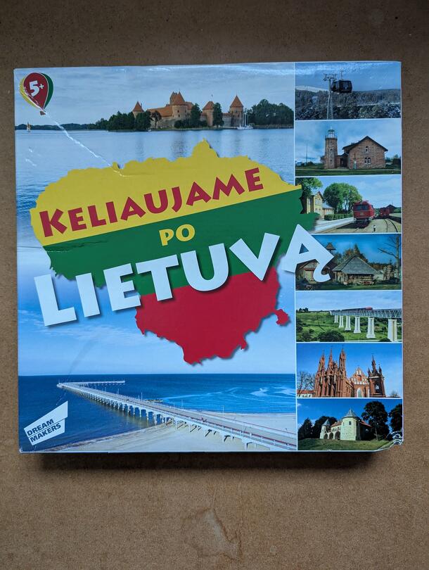 A straightforward lock-and-reroll dice game. Players take turns to attempt to roll a combination matching one of the currently available cards. The game deck consists of 40 cards, each showing a tourist point of interest in Lithuania and a set of 2–4 die rolls that are required to successfully visit it. Cards with 2, 3, 4 dice on them are worth 1, 2, 3...