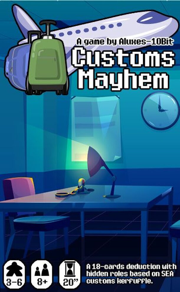 Holiday's over! As you stepped on your home country's soil, you have been selected along with several other passenger for a random security check! Customs Mayhem is an 18-cards bluffing and deduction game fit for 3-6 players, where each player holds a hidden Role Cards that determines their winning condition aside from being the last man left standing....