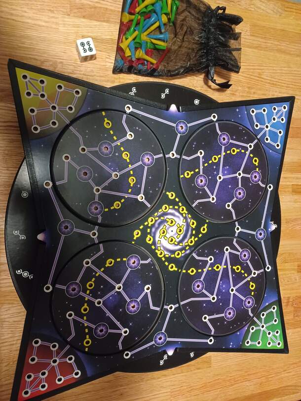 A Chinese Checkers-like race to get your pegs (ships) to the other side of the board, navigating along routes between various types of stars, and sending other players' pieces into the black hole, from which they need to escape. Landing on certain types of stars forces a die roll, the result of which will make sections of the board rotate - forcing you to...
