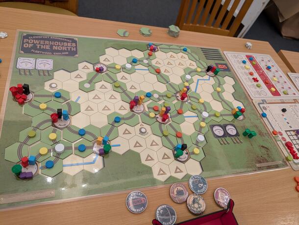 Two maps released for, and given out to all attendees of the inaugural Age of Steam UK weekend. Powerhouses of the North takes inspiration from the city delivery and growth idea in the famous Splotter game Indonesia and interprets it onto the Age of Steam system. Cities start off with no set colour but as deliveries occur the colours are set for the game....