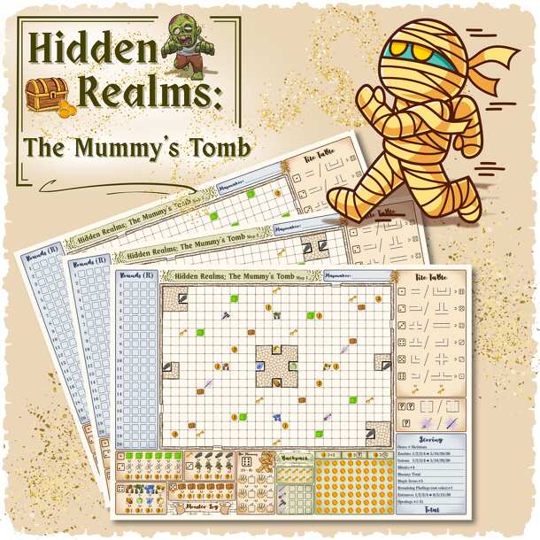 Hidden Realms: The Mummy’s Tomb is a single-page, Print & Play, Roll & Write dungeon crawl inspired by classic D&D maps. Draw polyomino shapes to map a new dungeon every game. Uncover treasure in the form of coins, keys, and magic items. Face deadly guardians, like oozes, skeletons, zombies, golems, mimics, and the Mummy itself. Plan carefully, because...