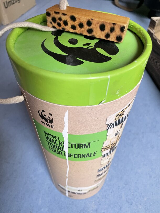 This is a variant of Jenga, published without rules, but including a wooden six sided dice. Each building block is either blank, features the WWF panda logo or is painted with the fur patterns of either giraffe, cheetah or zebra. The dice has coresponding sides to the blocks and therefore supposingly is to be rolled to determine, which type of block is...