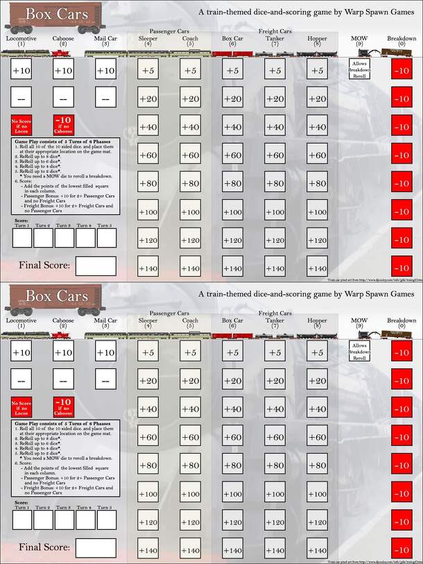 “Train-themed Dice-and-scoring game for one or more players. Use 10 sided dice. 10 dice are required.” A player starts his turn by rolling 10 dice. The player then has the option to re-roll up to eight of the dice, then up to six, then up to four, and finally re-rolling up to two. The resulting combination of numbers are scored using the names of train...