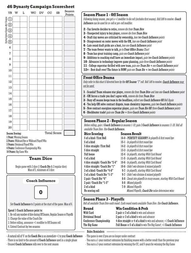You are an aspiring pro football head coach, and have just signed a 5-year contract with a struggling franchise. They were 3-13 last season and are in re-building mode. You are tasked with improving the roster, using your influence to get the most out of your team, and bringing a championship to your new city. d6 Pro Football Dynasty is a light...
