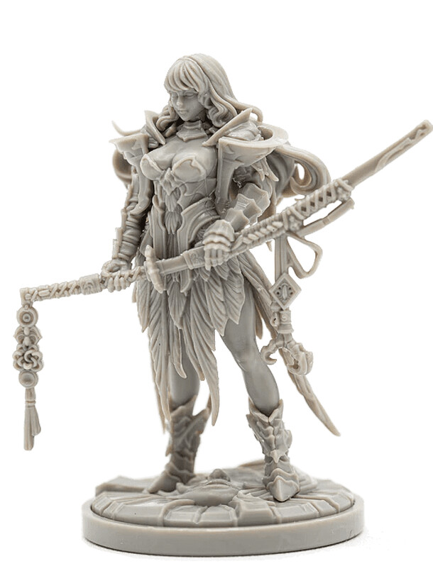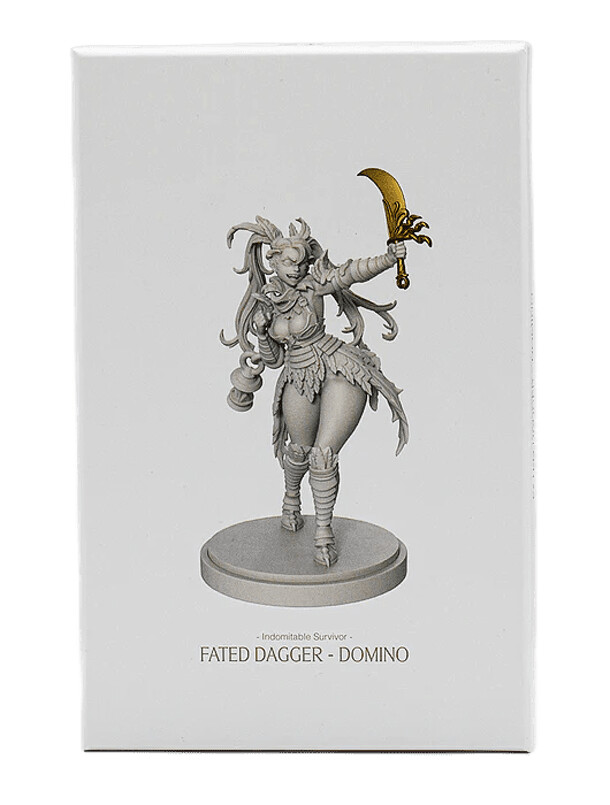 Fated Dagger - Domino is packaged in a graphic box that includes: 1 x Fated Dagger Domino hard plastic miniature 1 x Hard plastic Kingdom Death 30mm base and insert 1 x Fortune Feather Phoenix indomitable resource card 1 x Fated Dagger pattern card 1 x Fated Dagger gear card 1 x Install guide card 1 x Large matte art print The shearing winds battered her...