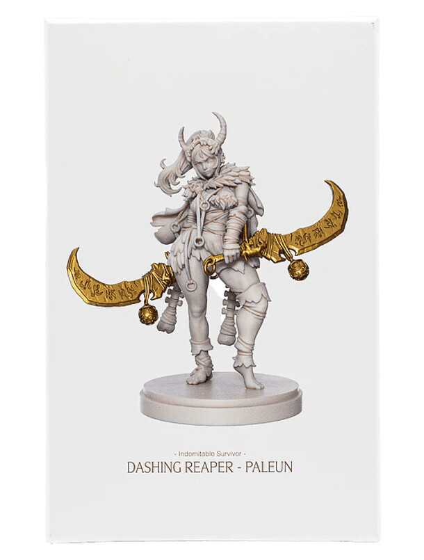Dashing Reaper - Paleun is packaged in a graphic box that includes: 1 x Dashing Reaper - Paleun hard plastic miniature 1 x Hard plastic Kingdom Death 30mm base and insert 1 x Gnawed Gastrolith Screaming Antelope indomitable resource card 1 x Dashing Reaper pattern card 2 x Dashing Reaper pattern gear card 1 x Install guide card 1 x Large matte art print...