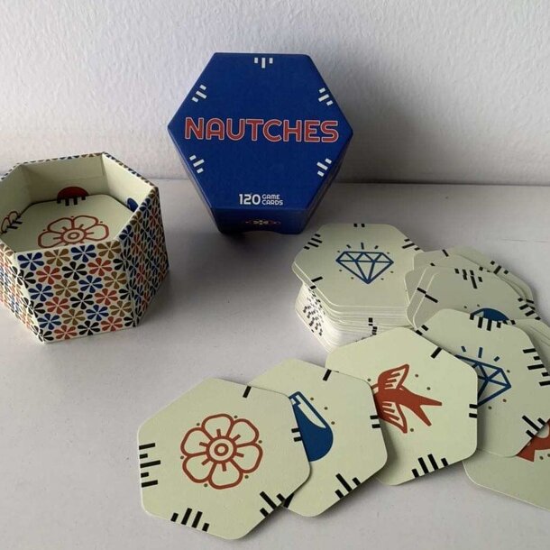 Nautches is a deck of 120 hexagonal cards, used to play a number of abstract games ranging from two-player territory-building games, to multiplayer trick-based games, to meditative solitaire games. Each side of a Nautches card is marked with notches indicating a value between 0 and 5. Each of the 120 cards has a unique sequence of notches. Each card also...