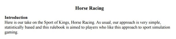 Roberto's take on the Sport of Kings - Horse Racing - is a simple, statistically based sports simulation allowing gamers to replay historical Flat, Jump, Steeplechase, and Harness races from 1900 into the 21st century. Horses are classes A through H and may also have a set of asterisks indicating their chances of winning close races. The races are run over...