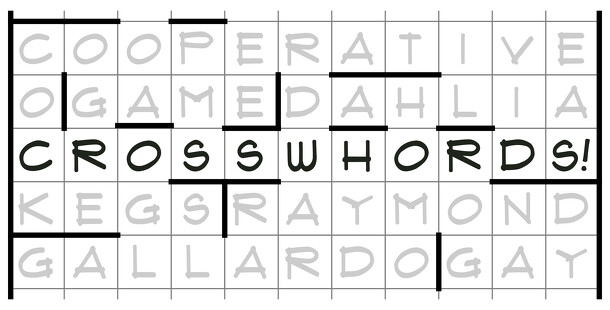 In Crosswhords! players cooperatively construct a barred crossword, a crossword where heavy lines drawn along grid squares separate words instead of black squares. Players start with an empty grid. They devise a list of categories and then enter a word or phrase in the middle of the grid. On your turn, you think of a word that fits in one of the categories...