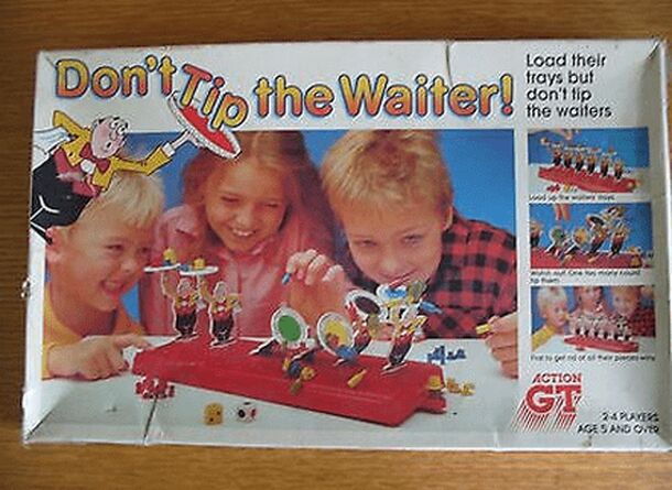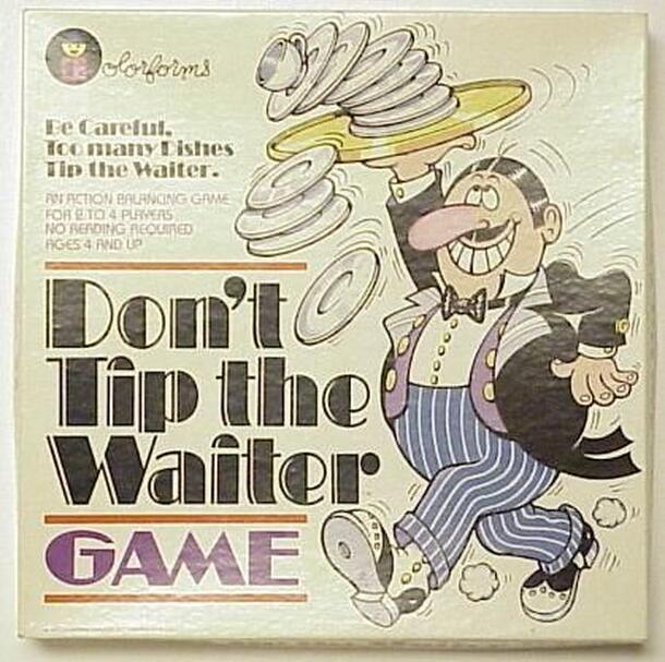 Be careful. Too many dishes tip the waiter. An action balancing game Ages 4 and up. First you assemble the 3-D cardboard waiter. Then you carefully place cardboard plates of food on his tray. If you make him lose his balance, you pay ("tip the waiter," get it?). Colorforms dollars stick to the waiter wherever you put them. Last player to still have money...
