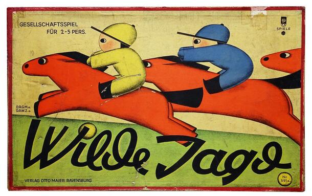 The playing pieces are placed on their colored starting spaces, and the horses on space 9 (the stable). With 2 players, 4 horses are placed on the stable; with 3 players, 5; with 4 players, 6; and with 5 players, all 7. The players' objective is to get as many of their mounted pieces as possible to reach the finish line. Players take turns moving a piece...