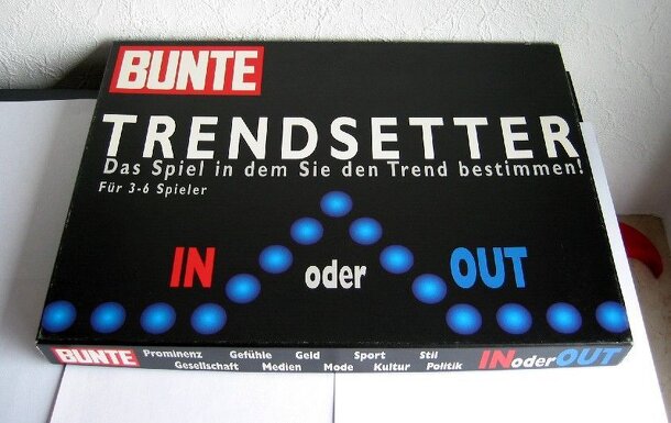 Players try to guess whether a certain thing (Range is e.g. from Pizza to Gene technology) is "In" or "Out" at the moment. One player chooses one topic/thing etc. from a given card and reads it out. Depending on the square the player stands on the others have to guess either whether the thing is "In" or "Out" generally or the players opinion about the...
