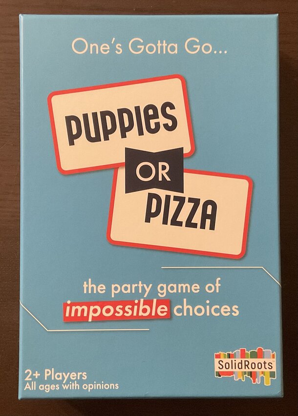 The party game of impossible choices! We've all had to choose between 2 terrible things: "Would you rather...?". But this one is full of all GREAT things. And you and your group have to vote on what you can't live without. Puppies or Pizza can be played multiple ways, but the easiest is to draw cards, set them up on the board in a tournament-style bracket...